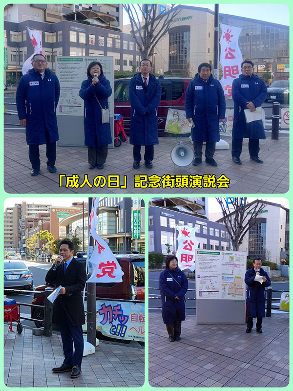 1月13日 草加市議団6名と蒲生県議と共に獨協大学前駅に於いて「成人の日」記念街頭演説会を行い、新成人の皆様にお祝いの言葉と若者に対する公明党の政策などを伝えました。