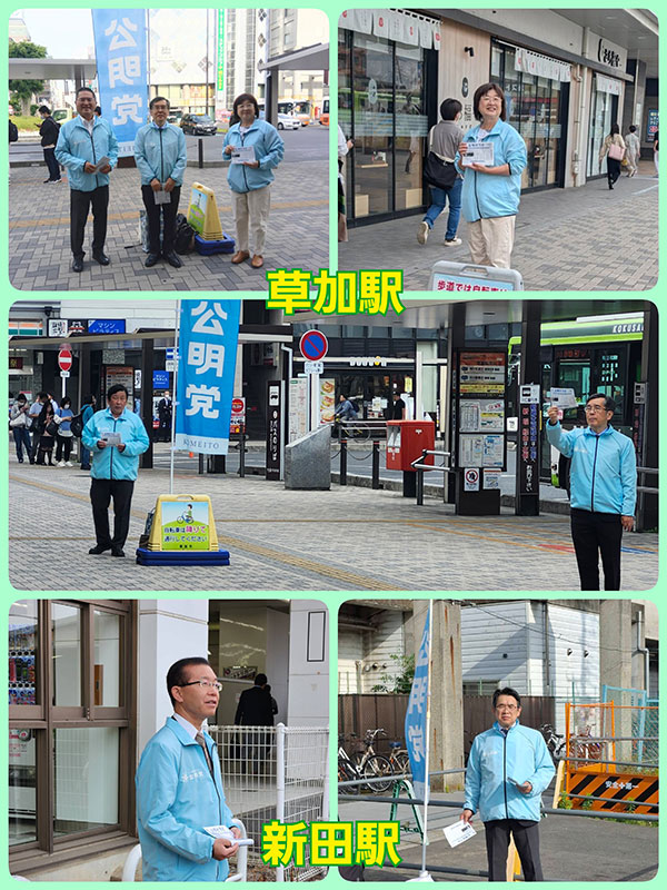本日は、市議団が二手に分かれて、草加駅西口と新田駅東口にて、『公明そうか』を手に朝の街頭を行わせていただきました。