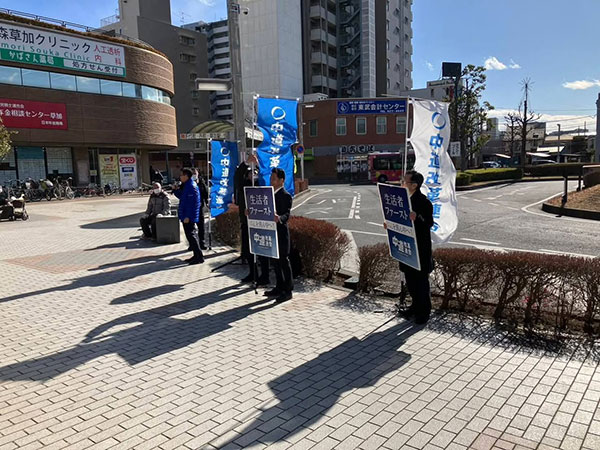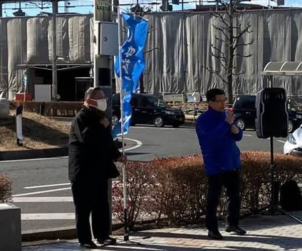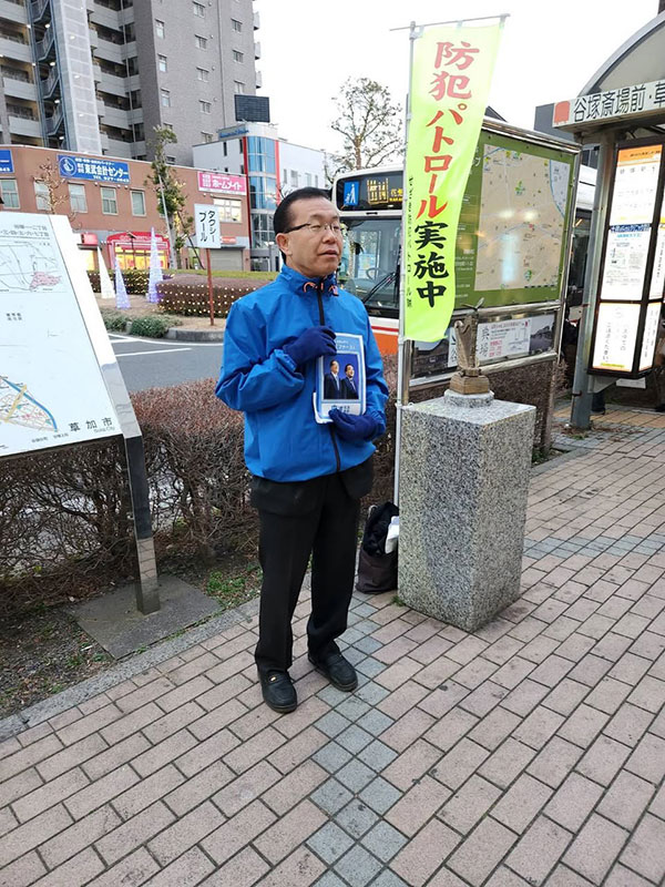 蒲生県議団団長と草加市議団の皆様と獨協大学前駅へ。その後、企業の朝礼へ。