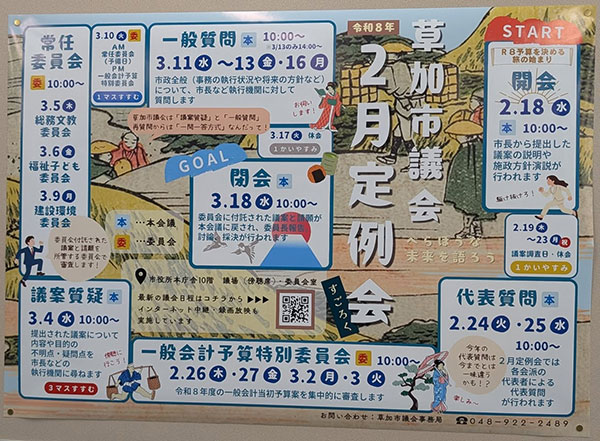 草加市議会2月定例会の代表質問・一般質問の内容を各市議より報告。