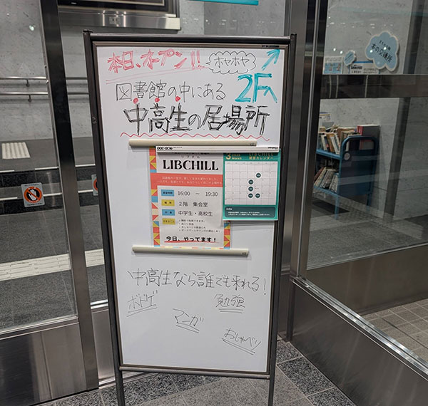 中央図書館の新たな取り組みが始まりました。図書館の中に中高生のための新しい居場所LIBCHILL(リブチル)がオープンしました。出入り自由、おしゃべりや飲食もOKの場所です。
