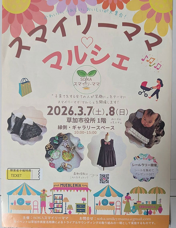 先日、草加市役所の1Fの縁側・ギャラリースペース、駐車場を使用してスマイリーマママルシェが開催され、2日間とも、大変なにぎわいでした。今回のイベントのテーマは“子育てをする全ての人が笑顔“