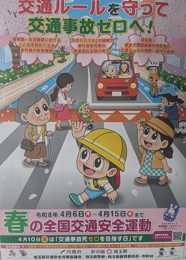 春の全国交通安全運動が、4月6日(月)から4月15日(水)までの10日間実施されます。この期間中の4月10日(金)は「交通事故死ゼロを目指す日」と定められています。