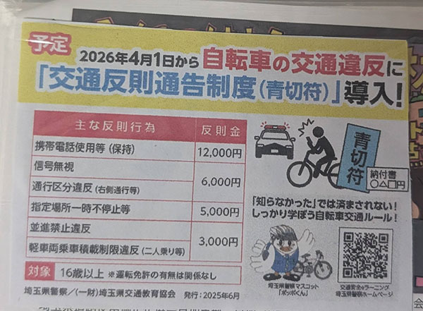 ①4月から自転車への交通反則通告制度(青切符)が導入されました。多くの市民相談を受けております